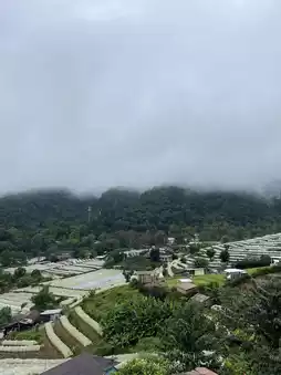The atmosphere here is simple yet charming. Sip a hot cup of coffee or tea and watch the mist roll over the mountainside. 🌿☁️ Some corners even offer views of terraced strawberry fields, perfectly blending with the natural surroundings.