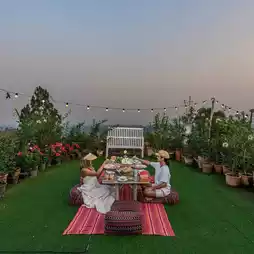 The restaurant and bar are near the koi pond. When we went, we had a barbecue on the rooftop near the restaurant, which was so awesome. The atmosphere was great, grilling pork and looking at the mountain view.