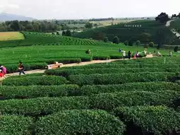 Choui Fong Tea Plantation, Mae Chan District, Chiang Rai Province In addition to the tea plantation on the high mountain at Doi Mae Salong, there is also this tea plantation that is popular and attracts tourists of all ages. It is located on a large area and is the closest to Chiang Rai city. Traveling is quite convenient. For those who get motion sickness, mountain sickness, or are inconvenient to drive up a high mountain, this tea plantation is the perfect answer. The tea plantation is planted along the mountain. The area that provides services to tourists is beautifully organized and has a place for taking pictures, visiting the tea plantation in an exclusive way, tasting tea, and buying souvenirs from the tea plantation. There are many types and flavors of tea, depending on each person's preferences. But our favorite is fresh milk green tea, ordered with green tea steamed buns, surrounded by green tea trees as far as the eye can see. It's so awesome. #ChooifongTeaPlantation #ChiangRaiTravel #OolongTea #GreenTea #teaplantation #chiangrai