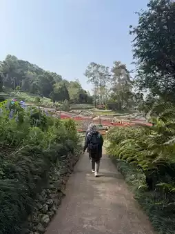 The stone walkway and fountain garden are designed to naturally fit into the hillside. The flower beds are arranged in a rainbow-colored field. The Tree Top Walk & Zipline adds a new perspective for visitors to enjoy the view from above the treetops. #GetDiscountsWithoutLuck