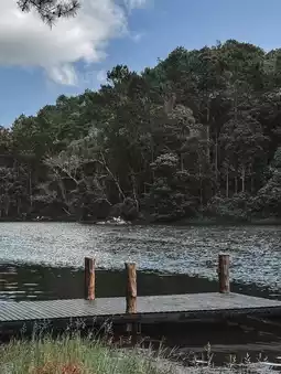 This is a lake in a valley surrounded by pine forests. It is both a tourist attraction and a place for relaxation. You can stay overnight in the park's huts or set up a camping tent.