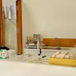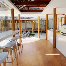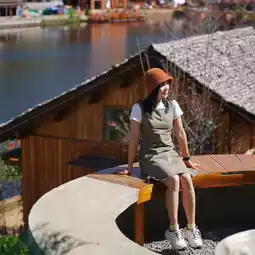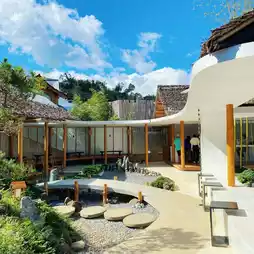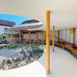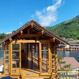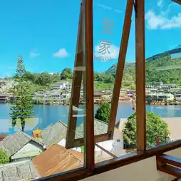 A newly opened cafe with a nice atmosphere, overlooking the mountains and lake from a high angle. The highlight is the beautiful natural view. The shop is located on a hill with a staircase connecting to the parking lot. The interior of the shop is decorated as a Japanese-style garden. The shop is in white and brown tones, looking spacious, clean, and a little Muji, giving a relaxing feeling. The shop is open-air, not hot, with many seating areas and photo spots. This place offers both a cafe and accommodation. The usable areas are clearly divided, providing privacy.