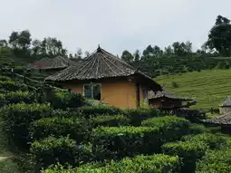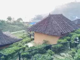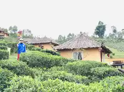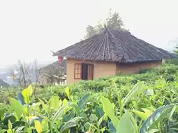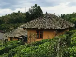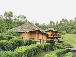 A resort with adobe houses in the middle of a tea plantation, surrounded by cool air and a romantic lake view