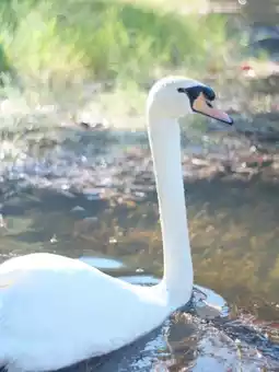 floating above the surface of the water, amidst the beautiful view of two pine trees.