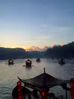 🏞️ The morning air is cool, and mist floats over the lake. Sit in a traditional Chinese-style wooden boat and sip hot tea. ☕🛶 Listen to the gentle sound of the water lapping against the shore. It's incredibly romantic. You'll see mud houses and Yunnan-style teahouses, and red lanterns reflecting on the water make for beautiful photos. 📸✨ After getting off the boat, stop for some steamed buns, pork leg, or grilled pork to cool off.
