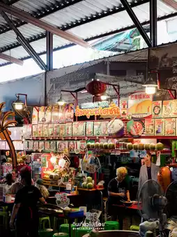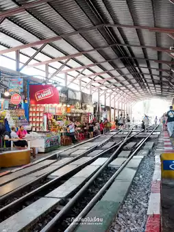 Inside the Maeklong Railway Station, there are also souvenir shops selling various items such as clothes, local products, and Thai desserts that are suitable for buying as souvenirs. In addition, there are small restaurants around the station that serve local food such as noodles, crab curry noodles, and Thai desserts.