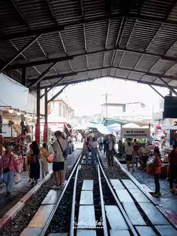 #Take a train trip Maeklong Railway Station, a tourist and cultural connection point near the Rom Hub Market, is another place not to be missed when visiting Samut Songkhram. It is located just a few steps from the Rom Hub Market, allowing tourists to conveniently walk around the market and experience the local lifestyle of people who collect umbrellas and goods every time the train passes by.