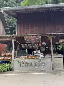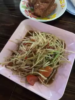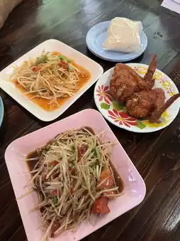 #GetDiscountsWithoutLuck We love going to Mae Kampong because we love the atmosphere, and our favorite restaurant for som tam is Sai Ua Mae Nim Mae Kampong. I have to say that the som tam here is delicious, with a flavor that's always the same every time. Order it with hot fried chicken, and it's absolutely amazing. They also have northern Thai food on the menu. Don't forget to try this restaurant.