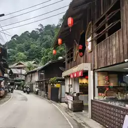 A small wooden village along a stream, lined with coffee shops and homestays.