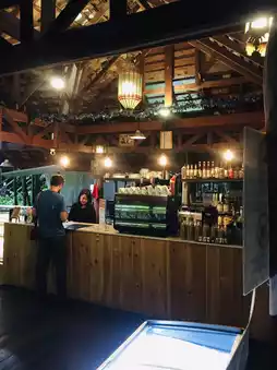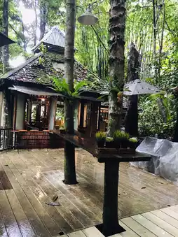 The most striking feature of this place is its incredibly natural setting. Nestled amidst the forest, a small stream flows through the premises, allowing you to hear the sound of the waterfall as you sip your coffee. The shop's wooden decor creates a warm, harmonious atmosphere. Seating is available both indoors and outdoors next to the stream, allowing you to fully enjoy the fresh air and tranquility of Mae Kampong.