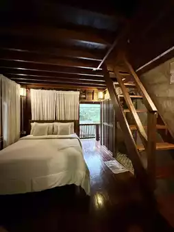 If you're in Mae Kampong and don't know where to stay, I highly recommend Him Doi Home. The rooms are incredibly well-priced. We got this room for less than two hundred baht, and it's even two stories high. The upper floor is a lovely attic. At the back of the room, you'll find a balcony with a view of the waterfall and mountains. It's incredibly healing. I highly recommend this great place to stay! 😍