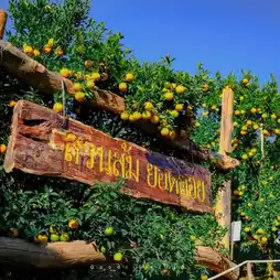 Travel to Chiang Mai to enjoy the cool weather. I recommend another orange farm. Here is Yoddoy the Orange Farm. It is an orange farm where you can come to take pictures and pick sweet honey oranges. Every tree is full of oranges. Let's go take pictures.
