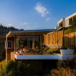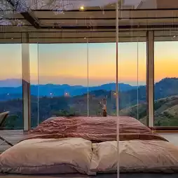 The sleeping area is surrounded by large glass windows on 3 sides.