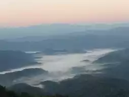 At dawn, "Hey! The sun is rising!" Stepping out in front of the house, I was met with a golden sky, silver mist, and layers of mountains that looked like a painting.