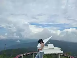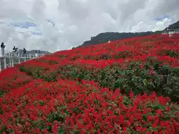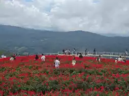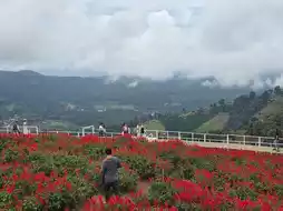 Atmosphere: This flower garden is located on a mountain. The flowers are planted in tiers, gradually rising upwards. It's not a flat garden, but it's surrounded by mountains, offering almost a 360-degree view. The mountain in front is still a mountain with trees, offering a lush greenery. The hills behind are lined with houses and resorts. There's a skywalk that allows you to walk around the garden. The garden also features a piano surrounded by flowers, with the mountain view in the background. This is a must-see photo spot. There's also a swing area and a rooftop restaurant with a panoramic viewpoint. The flowers in the garden are red, purple, and white. I'm not sure if the garden changes the types and colors each year. There's an entrance fee, and there's a souvenir shop selling locally sourced items. Drinks and snacks are also available.