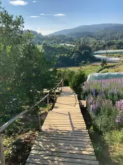 A visit to Mon Cham wouldn't be complete without taking photos with the flowers and oranges. For those with limited time and wanting to capture both beautiful flowers and an orange grove, we highly recommend Pang Hua Flower and Orange Garden. This orange and flower garden is located in Mon Cham, Mae Rim District, Chiang Mai Province. There's an 80 baht entrance fee, which can be used as a discount at the cafe inside. My friend and I had a glass of orange juice each, and we were absolutely thrilled! 😋🧡✨
