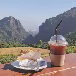 A cafe located in a valley on Doi Pha Mi with a nice atmosphere. Sit and sip coffee while enjoying the mountain view. This is another cafe that makes the most of its beauty. Surrounded by beautiful nature, everywhere you look is beautiful. Even the view of the walkway to the bathroom is beautiful. The shop has decorated the garden perfectly. There are many types of flowers. The cafe offers coffee, desserts, and food. I recommend trying the coconut cake. I must say that it is the most delicious and fragrant.