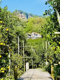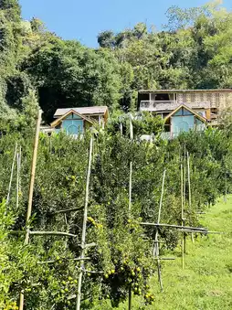 🚘When you arrive, park your car below the cafe. The shop provides a golf cart service to take you up. The path is surrounded by orange trees, which are very beautiful. 🌳