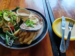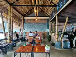 Atmosphere: This is an accommodation with its own cafe. It's beautiful and has a great atmosphere. We didn't stay here but stopped by for food and drinks. We ordered one dish, salmon steak, and one drink. The food was very delicious, living up to its reputation. We enjoyed our meal while taking in the beautiful view. We really liked it.