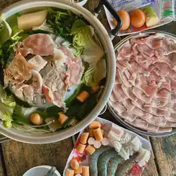 For dinner, you can choose between grilled pork or local dishes. Breakfast is delicious rice porridge with pickled vegetables, and a drip coffee set is provided.