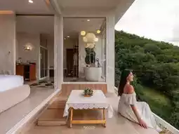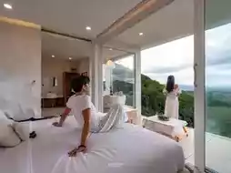 ☁️ There are only 2 rooms. The room name is (Cloudy). The concept is for customers to relax like they are in the clouds. The interior and exterior are in white tones. You can see the view from every angle. The bathroom also has a great view. What I like the most is the bathtub corner that is designed to be very beautiful for taking pictures. The amenities are complete. There is also free rose wine and bubble bath.
