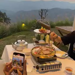 In the afternoon, there is an afternoon tea set. 🍵🍰🍓 In the evening, sit and eat grilled pork in the cool 16 degrees Celsius weather. It's a cool evening. In the morning, wake up to breathe fresh air and eat a full breakfast. 🥨🥯