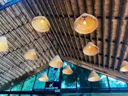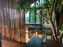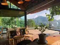 The café is surrounded by nature, nestled among coffee trees with a 360-degree mountain view. The décor combines industrial loft style with natural elements, featuring black and brown tones. The roof is made of thatched grass, and the open seating area allows guests to enjoy the fresh air.