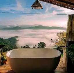 It's the rainy season, let's go out and travel. The charm of the green season is that wherever you look, it's green and the fresh white fog. Doi Mon Ngo is another place I'd like to recommend. It's located in Mae Taeng District, Chiang Mai Province. You can travel by private car. It takes about 1 hour from the city. For those who live in other provinces, when you fly to Chiang Mai Airport, you can rent a car at the airport to drive here. The road is a concrete road all the way. It's not difficult to drive.