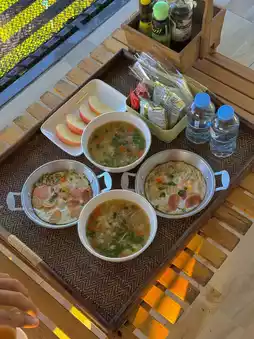 The accommodation has food for you to order, such as grilled pork to eat in the evening, which goes well with the atmosphere. In the morning, you will have a breakfast set of rice porridge, which is delicious. There is also a drip coffee set, which is really good.