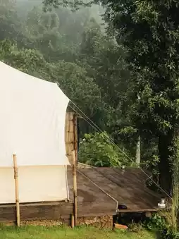 ✨ The weather is chilly at night and in the morning, fog drifts in front of the accommodation. The accommodation is a large tent with a fan inside, and outside, there's a bathtub, fireplace, speakers, and a water heater. The space is very spacious, with clear divisions between the sleeping tent, dining area, bathroom, and bathtub. It's very quiet and perfect for a relaxing getaway.