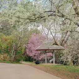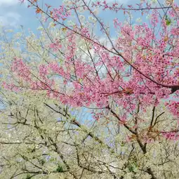 In front, there is a large white tree blooming with a pink tree, very beautiful