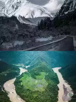 📍Guoguotang Great Bend: Where the Yarlung Tsangpo River makes a dramatic 270-degree turn—a breathtaking aerial view!