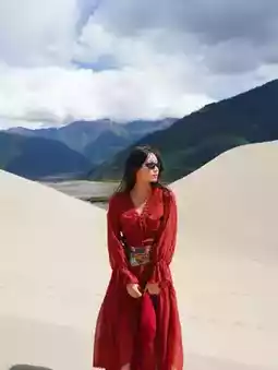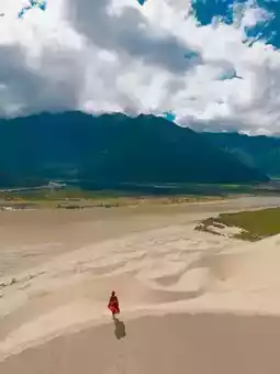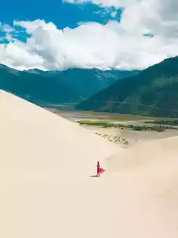 Deserts and Tibet are rarely associated with each other, but here is the Fozhang Sand Dunes located in Nyingchi. If you're lucky, you can see snow-capped mountains, lakes, deserts, and forests 🌳 all at once. Truly breathtaking!!! The red dress looks amazing in photos, so beautiful. If you come to Nyingchi, Tibet, you must visit here. Fozhang Sand Dunes