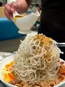 🍝 House Crispy Pancit Palabok, a noodle dish with shrimp sauce and crunchy toppings.