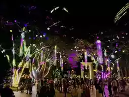 A riot of gold and colorful lights interweaves, enveloping trees, paths, and lawns in a sea of twinkling lights.