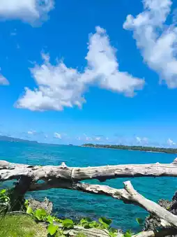 — The beach and blue boat background are beautiful against the blue sky, white clouds, and green trees, both for selfies and group photos.