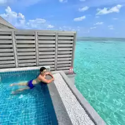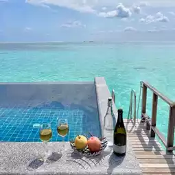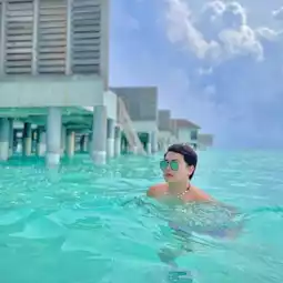 This time, I stayed in an Overwater Pool Villa. It's right on the water, and the green water is shallow, so you can stand up. The area is very spacious. There are two sides of the Overwater Villa: West and East. The West side is more beautiful, with a sunset, a Japanese restaurant, and a snorkeling spot.