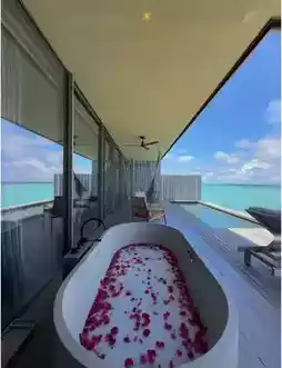 Rooms: Equipped with a king-size bed, private pool, separate shower and bathtub, etc., with a beautiful sea view, the room design is modern and simple.