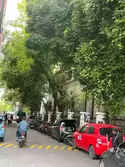 The image captures a serene urban landscape in the Maldives during its perpetual spring. The focal point is a modern, cylindrical building with numerous tiers of windows reflecting the soft, overcast sky. This contemporary structure is nestled amidst a surprising abundance of lush greenery, showcasing the unique blend of urban development and tropical nature characteristic of the islands.