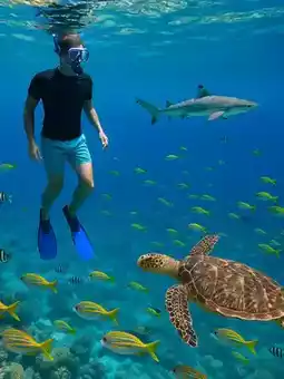 • Marine Life Encounters: Swim alongside graceful sea turtles, playful reef sharks, schools of tropical fish, and the occasional majestic manta ray.