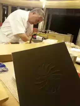 Inside is an open kitchen, right in the middle of the hall, where guests sit around, watch the food being made, and enjoy the food while chatting with the master.