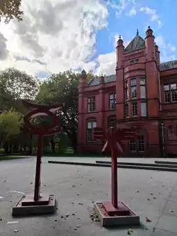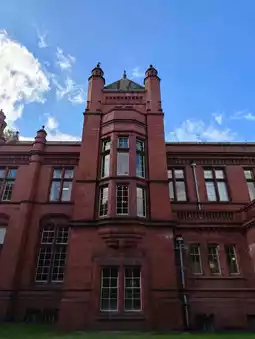 The Whitworth Building, nestled within the University of Manchester, stands as a quiet masterpiece of civic architecture. Its brownish-red façade glows warmly against the city’s changing skies, a rich palette of terracotta and sandstone that feels both historic and inviting. The design is grand without being imposing — symmetrical, stately, and softened by leafy surroundings.