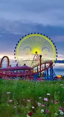 Arriving at the Matryoshka Doll Scenic Area, the lights were already on. Under the dazzling illumination, the area looked even more magnificent than during the day: buildings of various shapes and exotic styles shimmered and glowed in the velvet-like night; summer flowers surrounded the stunning architecture; the Ferris wheel continuously changed colors and patterns; the giant Matryoshka dolls smiled warmly at the visitors from afar, and the whole area was immersed in a sea of joy. At that moment, a slightly cool evening breeze blew, flowers whispered softly, and grass hummed gently, as if a group of spirits were singing a beautiful nocturne for the night visitors.