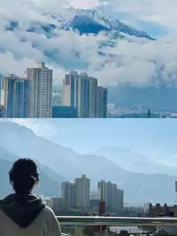 Standing on the balcony outside the coffee shop, you can see Jiuding Mountain in the distance and the tall buildings of Maoxian City looming in the mist. It's beautiful.