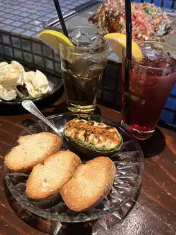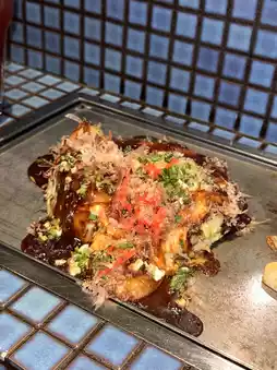 The okonomiyaki was chosen with tomato sauce and shrimp topping. The yam-based batter was soft and moist, and the tanginess of the tomato sauce and the mildness of the shrimp created a unique flavor. It offered a different charm compared to regular okonomiyaki.