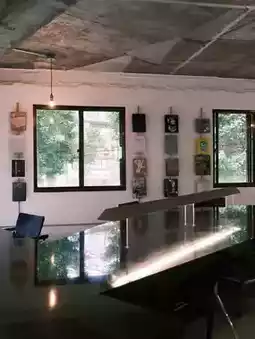 With a black-toned interior, a green view through the windows, and walls lined with foreign design books, this space exudes sophistication. Sensory music flows from large speakers, creating a refined ambiance.