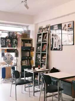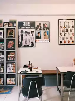 The space is filled with rock band albums, posters, and an analog audio system. Its black-and-white interior is accented with bold primary colors like blue and red, creating a hip and vibrant atmosphere🎸