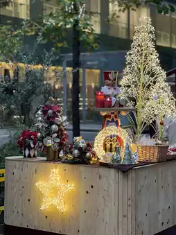 The theme changes with the seasons: umbrellas and sunbeds in summer, lights and heaters in winter, and a flower garden-like exhibition park in spring.