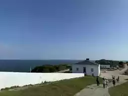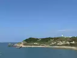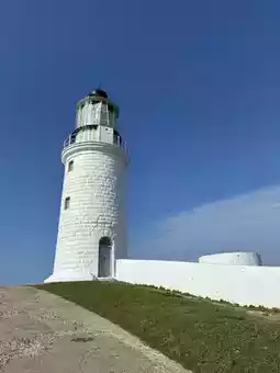 Standing tall by the coast, the lighthouse watches over passing ships. The horizon and sea merge into a serene blue, capturing a moment of quiet beauty.