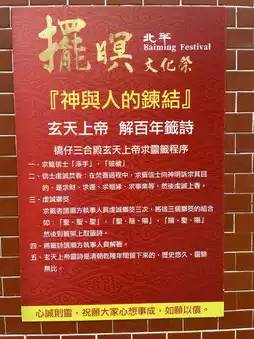 Xuantian Shangdi plays a particularly important role. He guards the four directions, slaying demons and evil spirits with his sword and stepping on a tortoise and snake, symbolizing the protection of the border and the people. During the Baiming Festival, Xuantian Shangdi is often worshipped alongside deities such as Mazu and the Five Camp Generals, protecting the island from evil spirits and praying for good weather and the safety of the people.